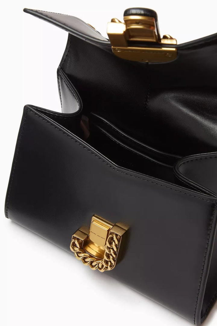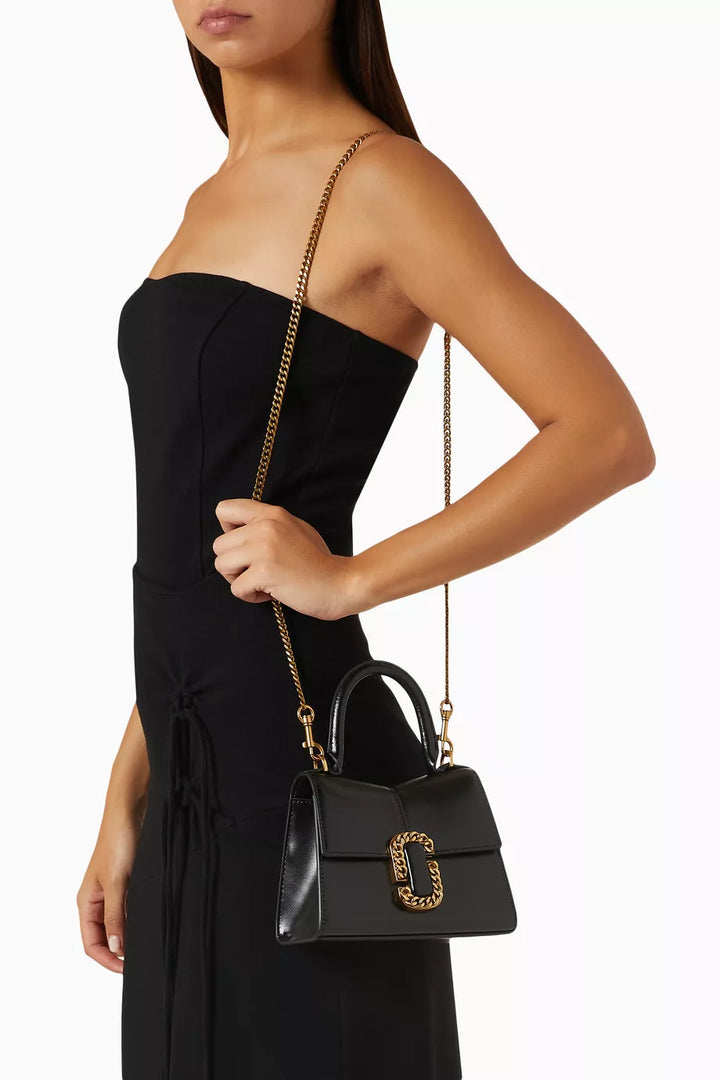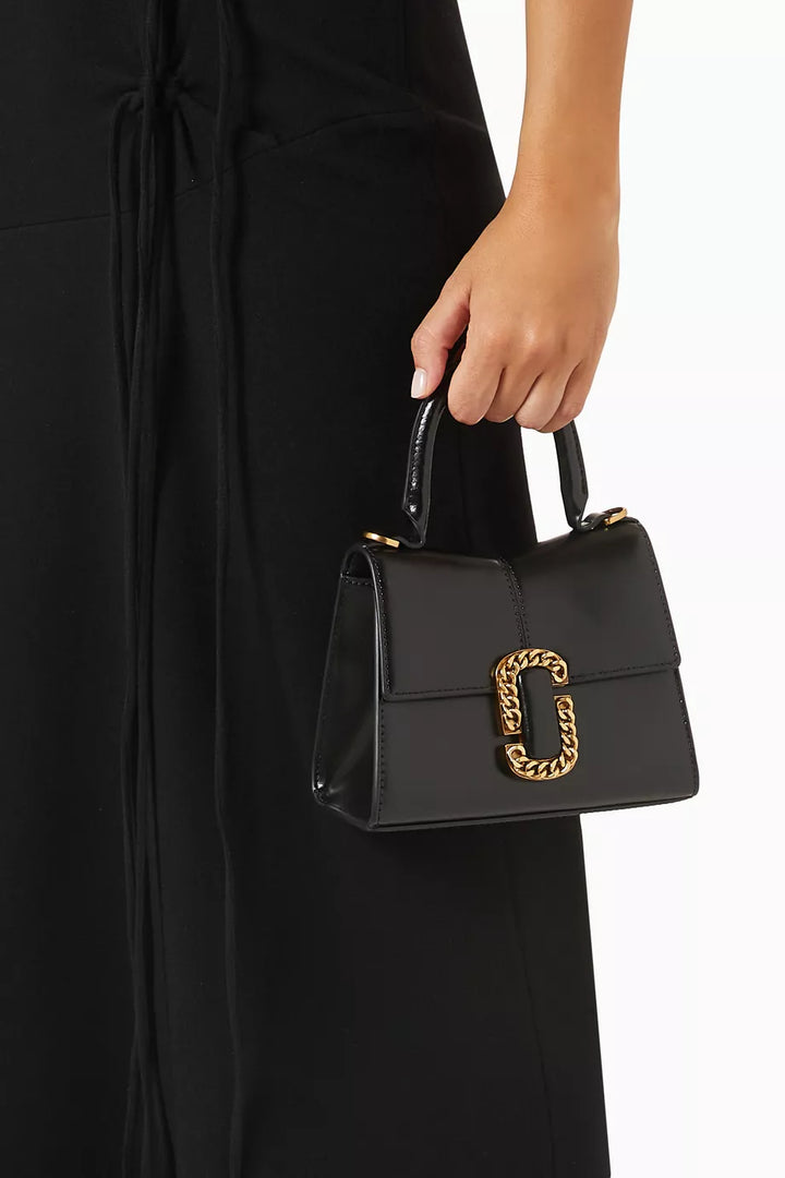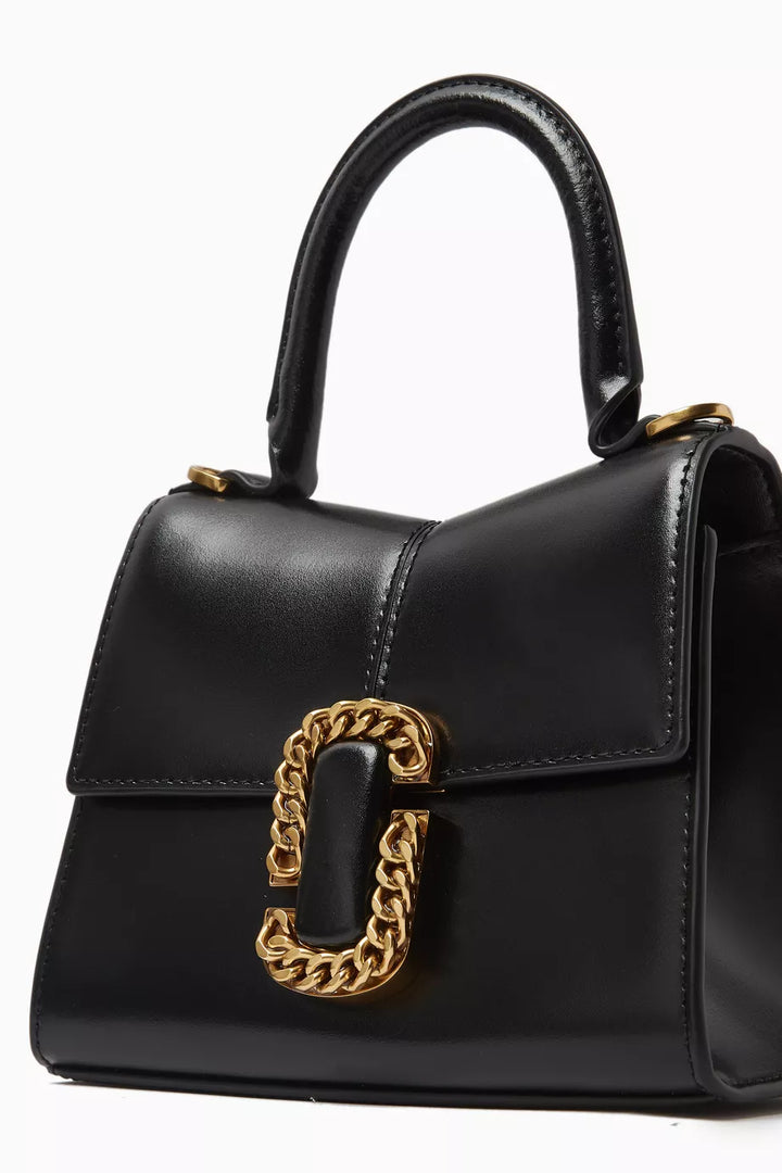 Inspired by the Fall 2016 runway St. Marc bag, the Mini St. Marc is a petite silhouette crafted from luxurious Italian leather. It’s designed with a distinctive “M” shape and sealed by a chain link J Marc hardware closure at front. Inside, it includes two card slots for easy organization. Carry by the top handle or attach the removable chain strap to wear as a crossbody bag for hands-free styling.