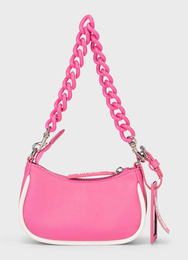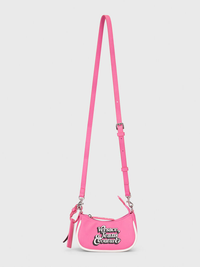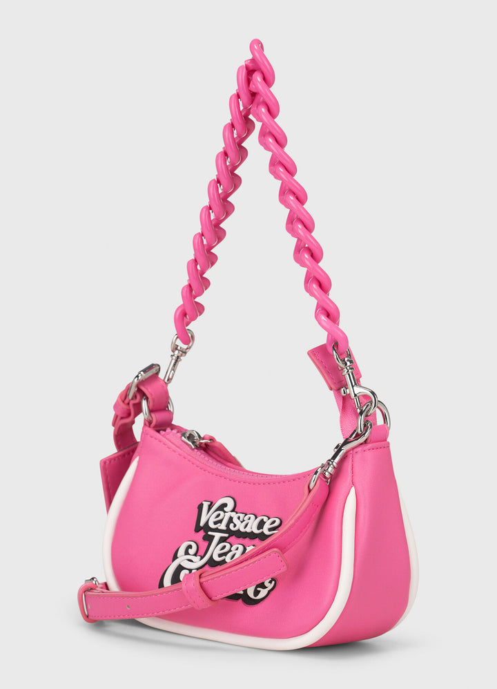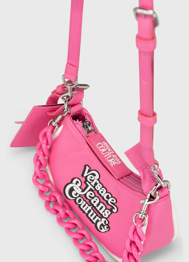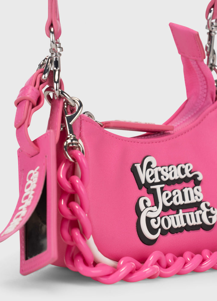 Pink shoulder bag from Versace Jeans Couture. Made of faux leather, this model is complete with a zip fastening, rubber logo, detachable plastic chain, adjustable shoulder strap, ID tag, silver-tone metal hardware and one internal compartment with one slip pocket.
